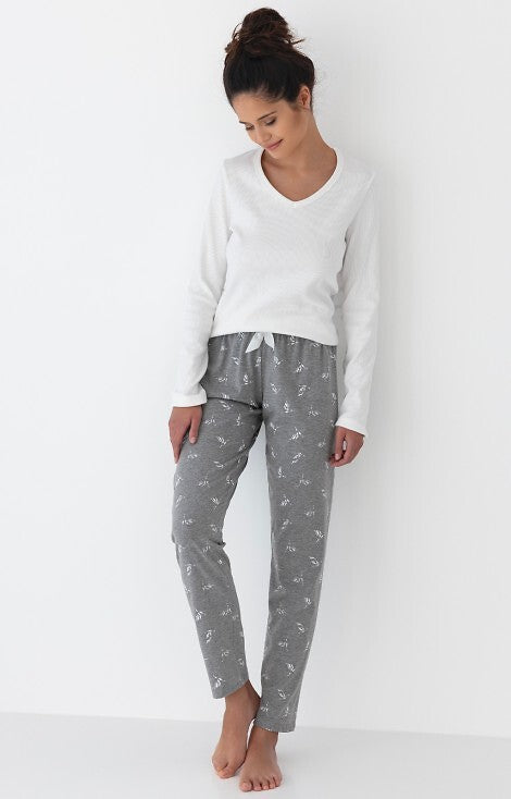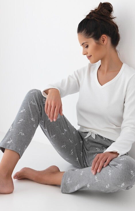 Απολαύστε απόλυτη άνεση με αυτήν τη γυναικεία πιτζάμα, φτιαγμένη από εξαιρετικά απαλή βαμβάκι υψηλής ποιότητας. Το σετ περιλαμβάνει μπλούζα με μακρύ μανίκι, κατασκευασμένη από ριμπ πλεκτό ύφασμα για ελαφριά αίσθηση και εφαρμογή που αγκαλιάζει το σώμα. Τα μακριά παντελόνια διαθέτουν ένα παιχνιδιάρικο σχέδιο με πουλάκια, χαρίζοντας μία φρέσκια και χαριτωμένη πινελιά. Η ελαστική μέση με το διακοσμητικό φιόγκο προσφέρει απόλυτη άνεση και σταθερότητα χωρίς να πιέζει.