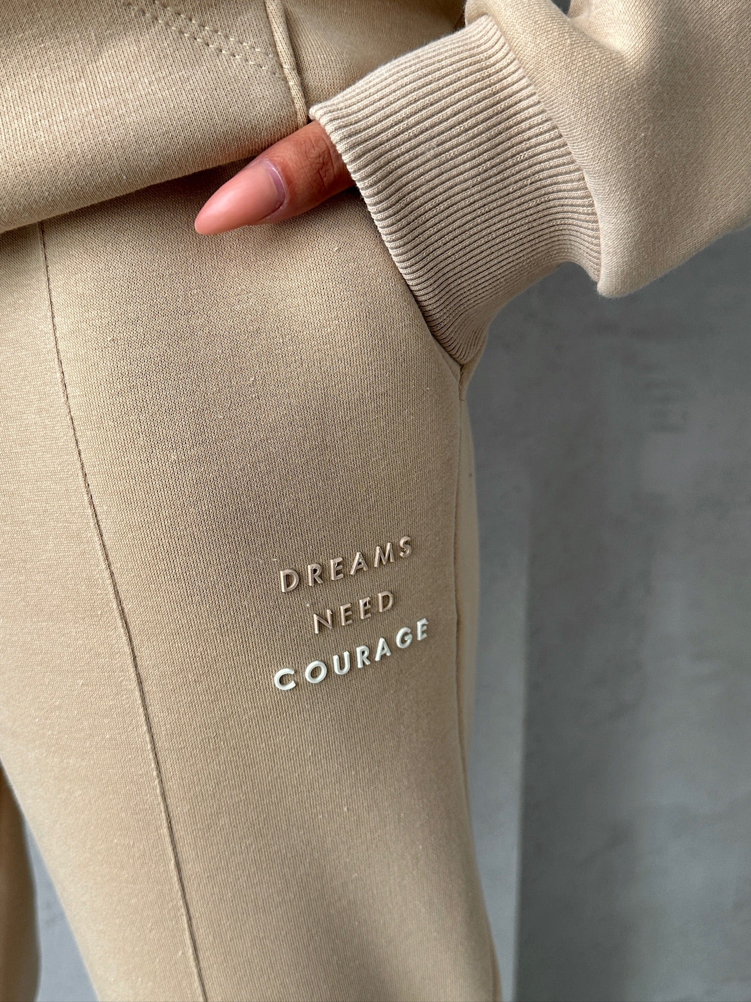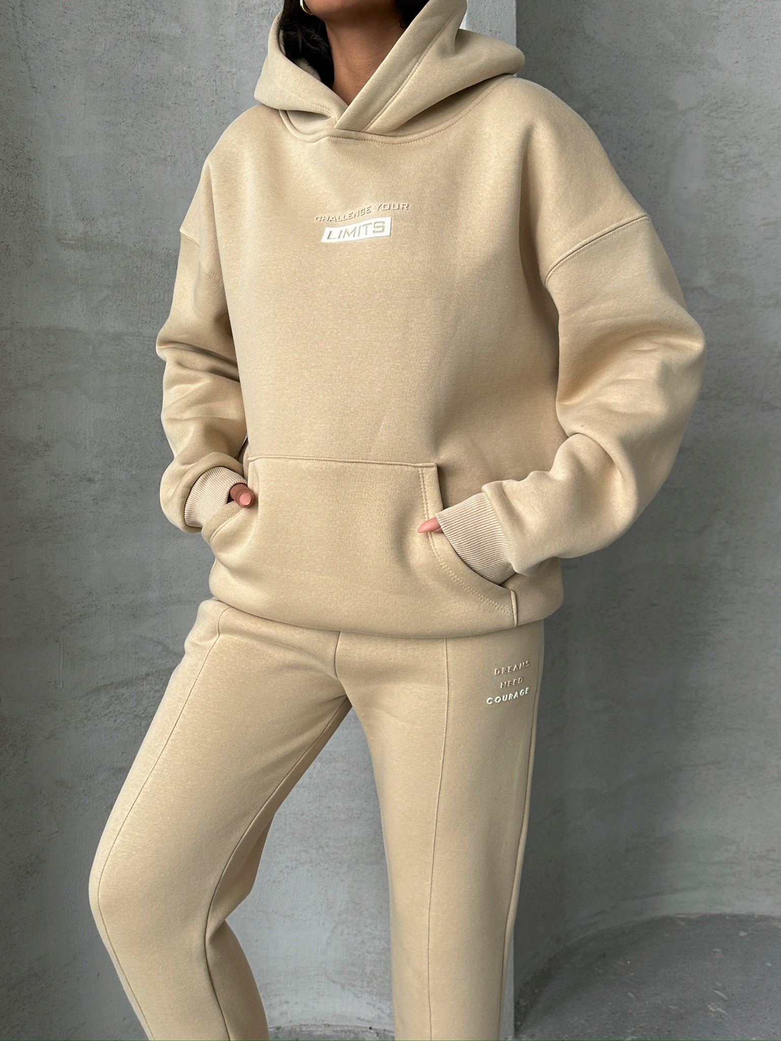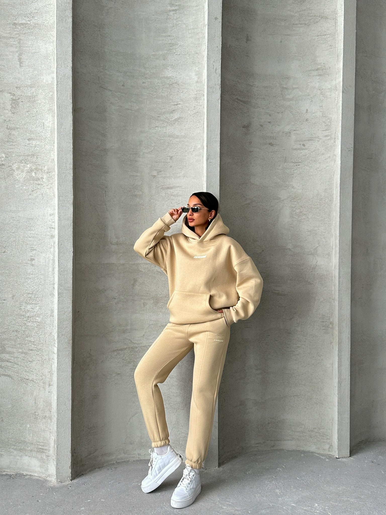 Αποκτήστε άνεση και στυλ με αυτό το κομψό σετ φόρμας σε μπεζ απόχρωση. Το σετ περιλαμβάνει ένα oversized hoodie με κουκούλα και μια πρακτική τσέπη τύπου καγκουρό, προσφέροντας μια μοντέρνα και casual εμφάνιση. Το παντελόνι διαθέτει στενή γραμμή με λάστιχο στο τελείωμα και στη μέση για τέλεια εφαρμογή και άνεση καθ' όλη τη διάρκεια της ημέρας. Κατάλληλο για χαλαρές εμφανίσεις, καθημερινές δραστηριότητες ή μια άνετη μέρα στο σπίτι. Συνδυάστε το με τα αγαπημένα σας sneakers για ένα ολοκληρωμένο athleisure look που θα σας κάνει να ξεχωρίσετε. Ένα must-have κομμάτι για κάθε γκαρνταρόμπα.