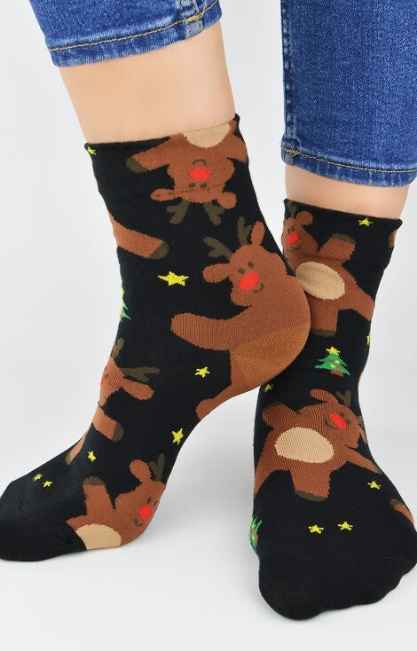 Προσθέστε χαρά και γιορτινή διάθεση στην εμφάνισή σας με αυτές τις κάλτσες που απεικονίζουν τον αγαπημένο τάρανδο του Άγιου Βασίλη, τον Ρούντολφ! Σε μαύρο φόντο, διακοσμημένες με χαριτωμένα σχέδια ταράνδων και μικρά αστέρια, αυτές οι κάλτσες είναι ιδανικές για να σας βάλουν στο κλίμα των γιορτών. Φτιαγμένες από άνετο και απαλό ύφασμα, είναι ιδανικές για τις κρύες μέρες του χειμώνα. Απολαύστε ζεστασιά και στυλ, είτε τις φοράτε στο σπίτι είτε τις προσφέρετε ως γιορτινό δώρο!